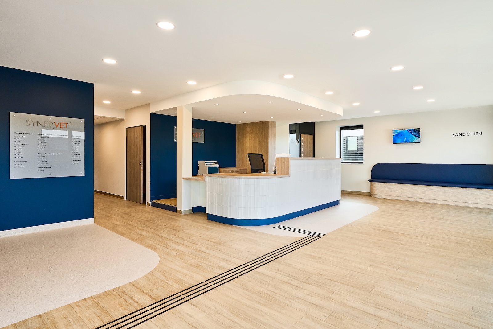 Nous avons également travaillé l’identité visuelle de la clinique avec choix des couleurs et des matériaux respectant la charte Synervet.