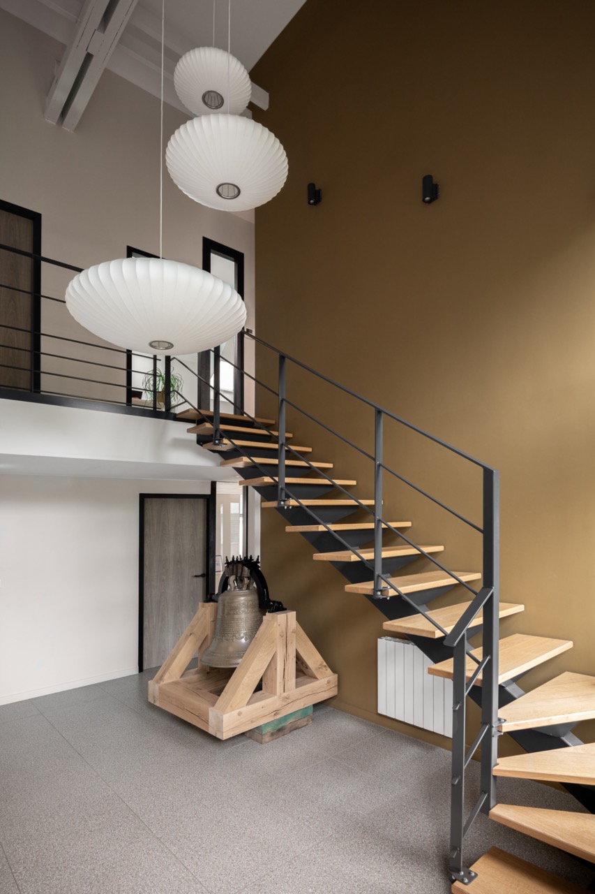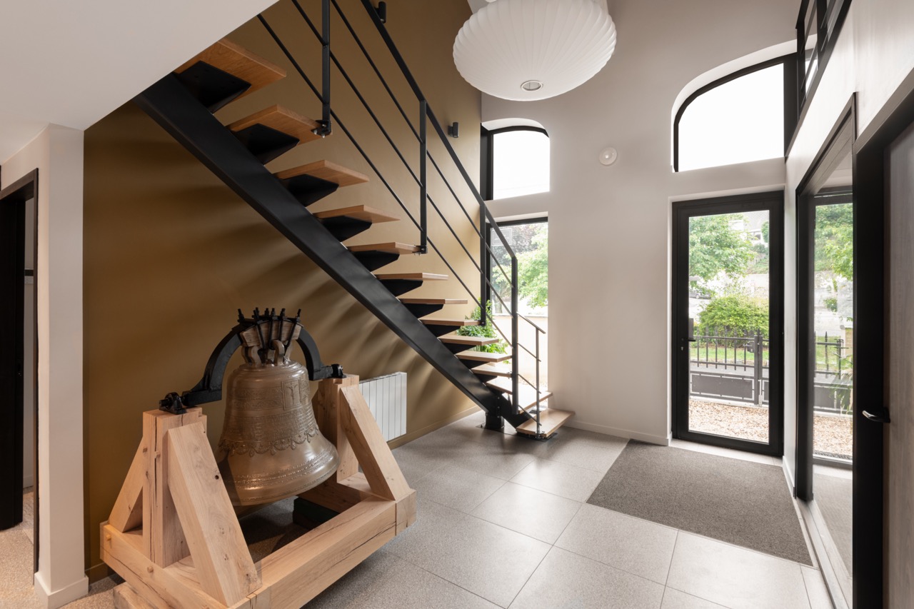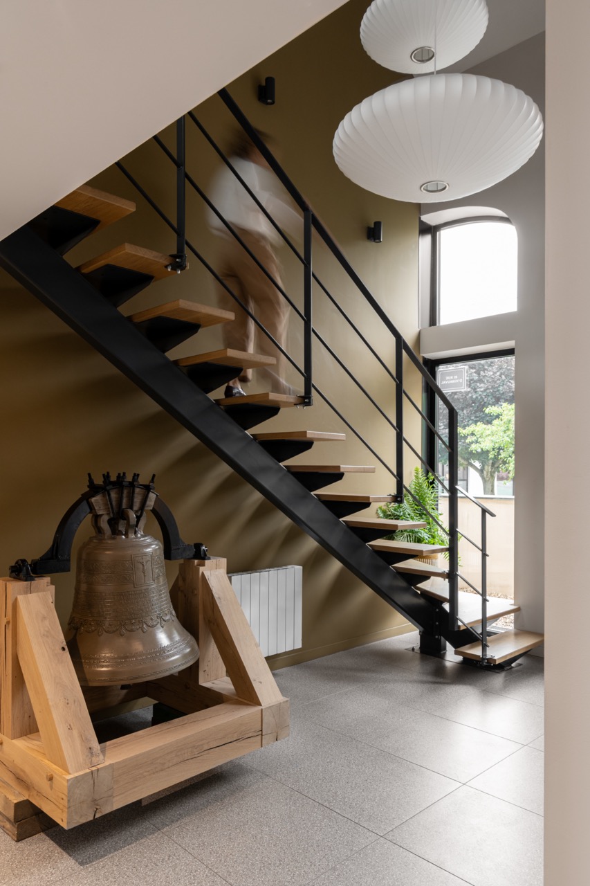 Comme un témoignage de respect à la genèse du bâtiment, la cloche trouve sa place dans l’entrée tandis qu’une moquette « vitrail » habille le sol de la salle de réunion .