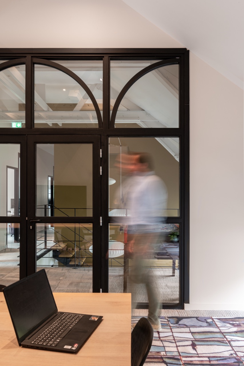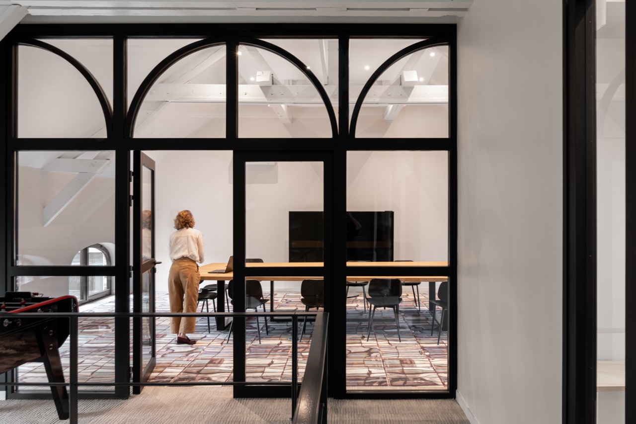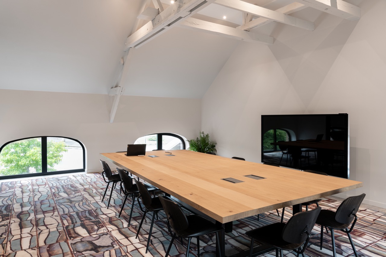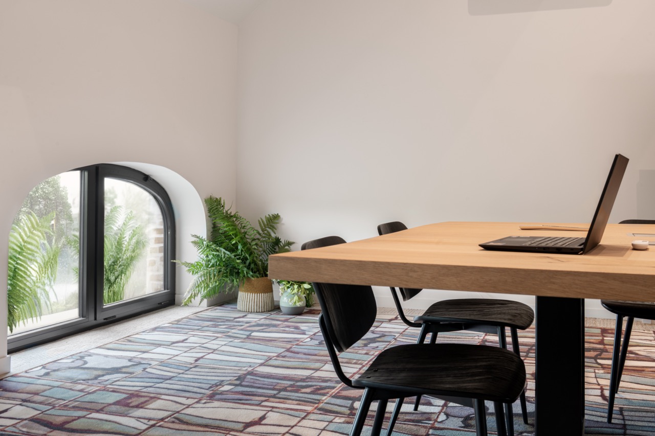 Comme un témoignage de respect à la genèse du bâtiment, la cloche trouve sa place dans l’entrée tandis qu’une moquette « vitrail » habille le sol de la salle de réunion .
